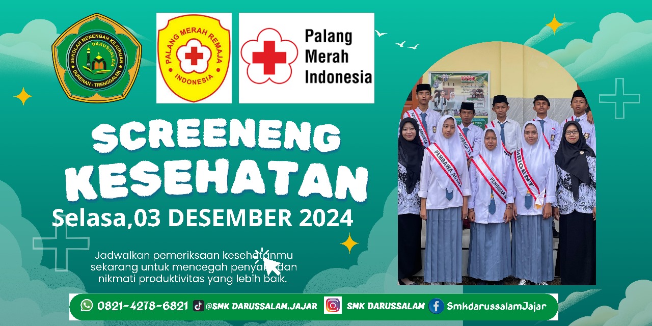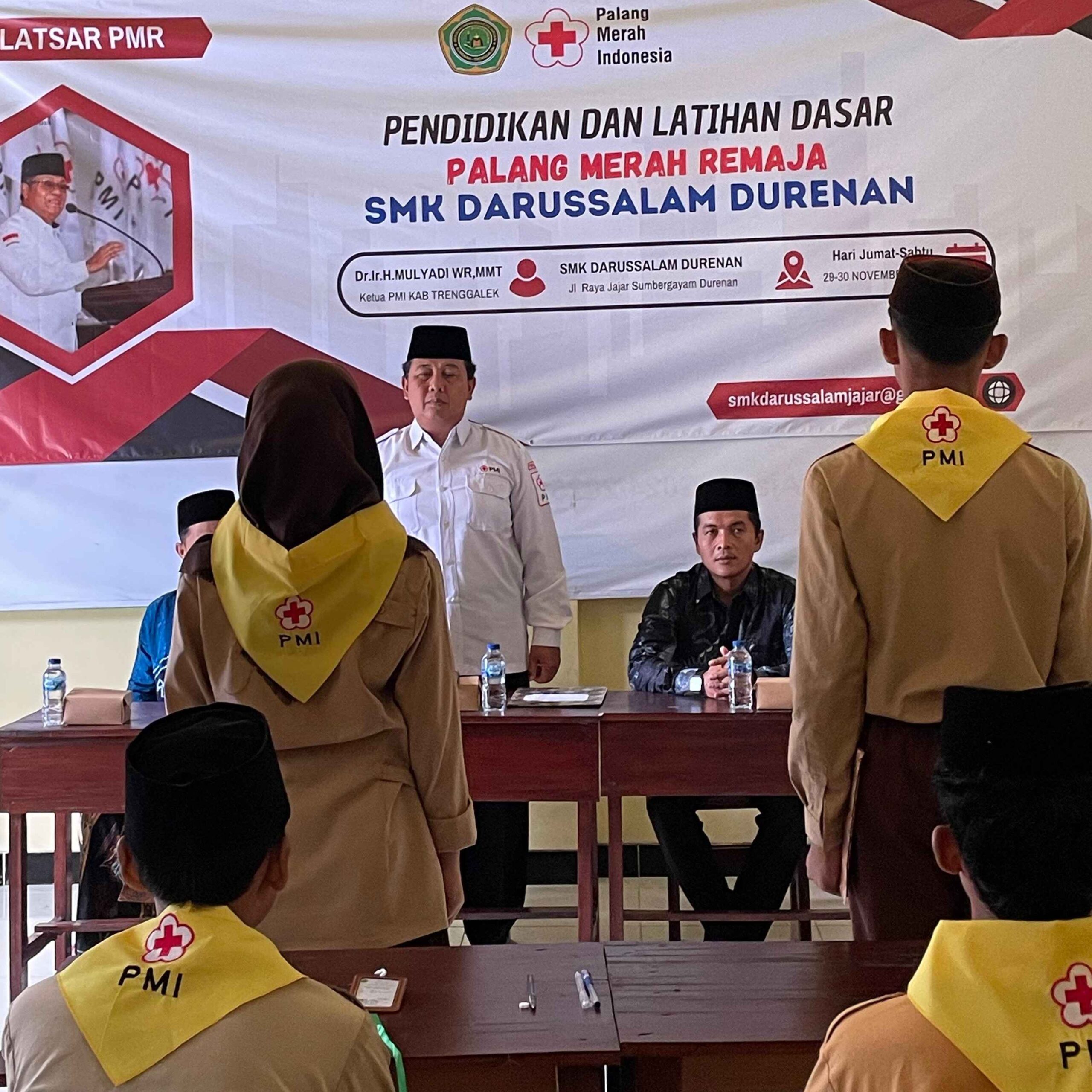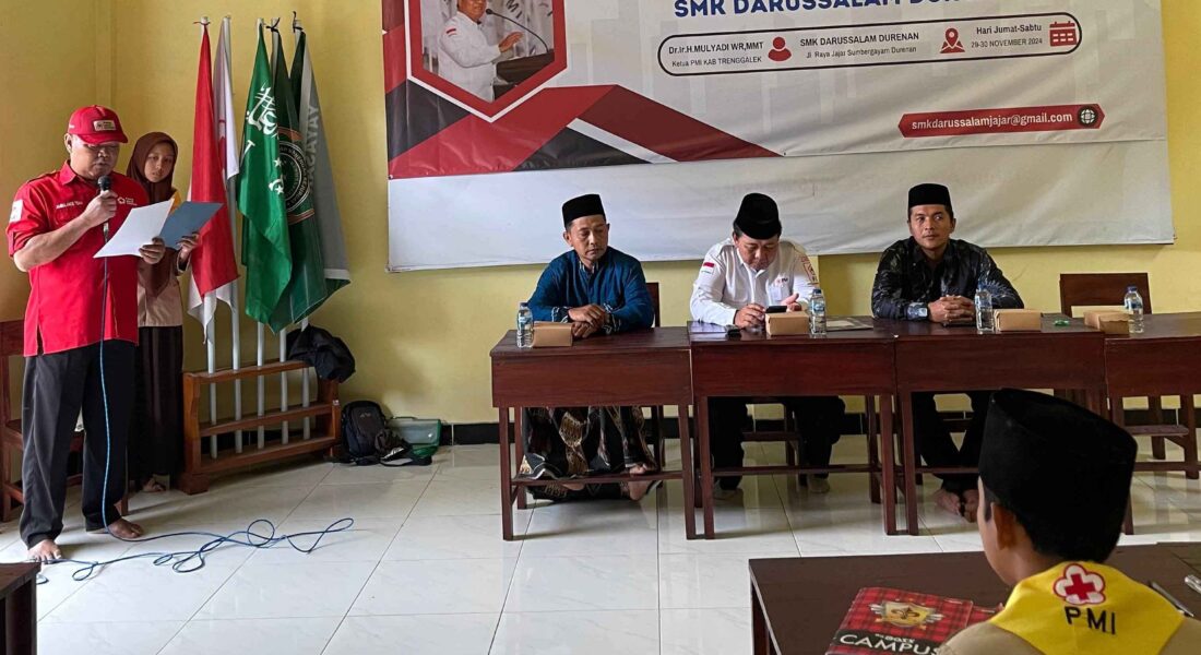 SMK Darussalam Durenan kembali menunjukkan komitmennya dalam membentuk generasi muda yang peduli dan berkarakter melalui kegiatan Pendidikan dan Latihan Dasar (Diklatsar) Palang Merah Remaja (PMR). Kegiatan ini dilaksanakan pada tanggal 29–30 November 2024, dan menghadirkan Dr. Ir. H. Mulyadi WR, MMT, Ketua Palang Merah Indonesia (PMI) Kabupaten Trenggalek, sebagai narasumber utama.