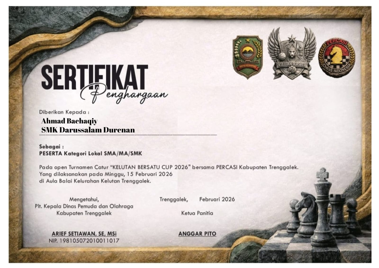 Trenggalek – Prestasi membanggakan kembali ditorehkan oleh siswa SMK Darussalam Durenan dalam ajang Turnamen Catur Kelutan Bersatu Se-Jawa Timur yang digelar pada Minggu, 15 Februari 2026. Kegiatan tersebut berlangsung di Kantor Kelurahan Kelutan dan diikuti oleh puluhan peserta dari berbagai kabupaten/kota di Jawa Timur.